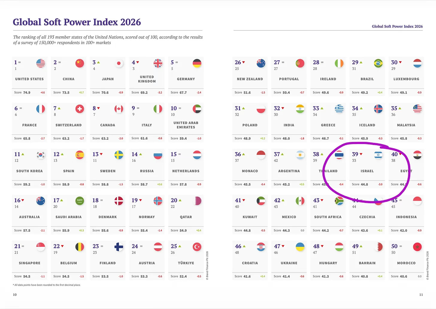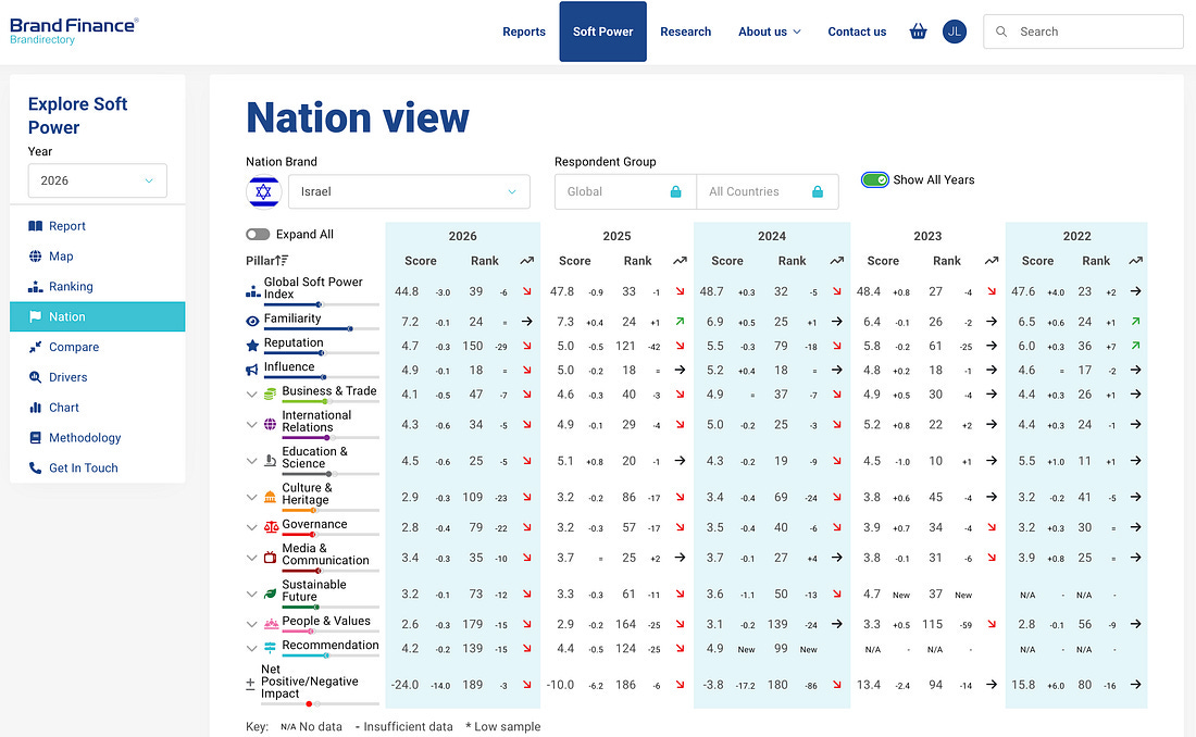 Israel recorded the steepest rank drop among the top 50 countries this year, falling six places with one of the largest score declines in the entire index. This is not a blip or statistical noise. It reflects sustained reputational erosion over multiple years. We may not be surprised, in light of everything that has happened since October 7th, but the trend matters more than the rank.